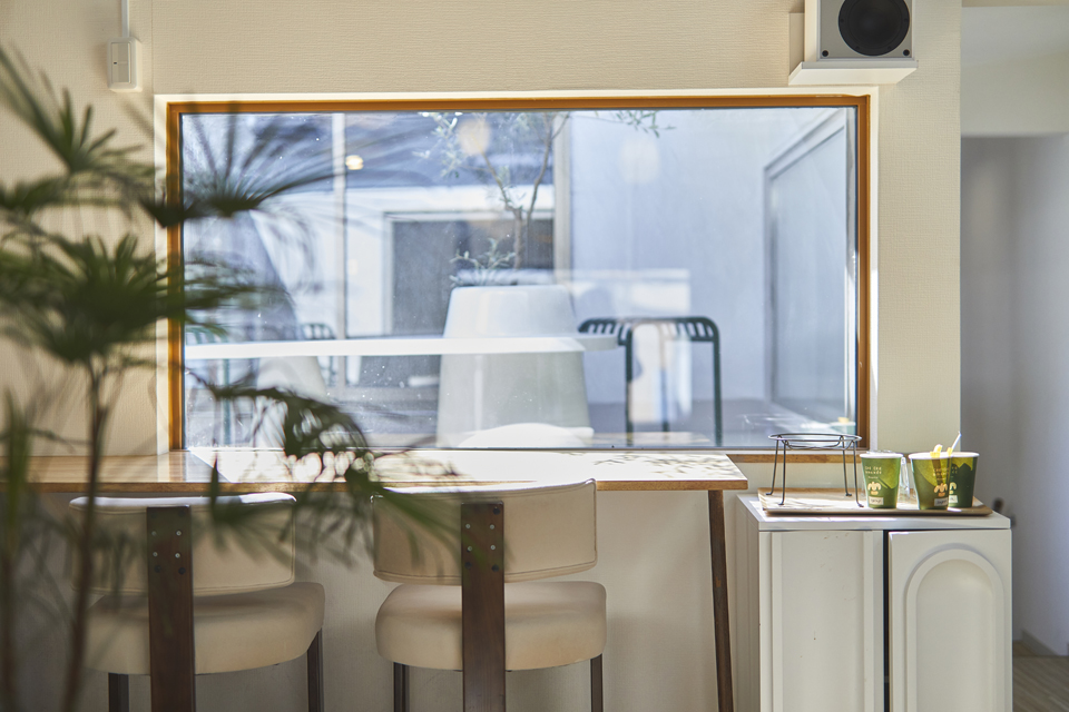窓際のカウンター席の向こうには、テラス3席も。青空の下で味わうダックワーズもひと際おいしいはず。