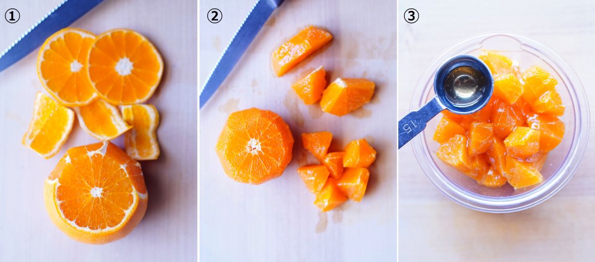 ①せとかの上下をカットし、外皮と果実の間にナイフを入れて、周りをそぎ落とします。