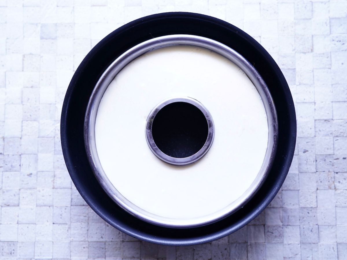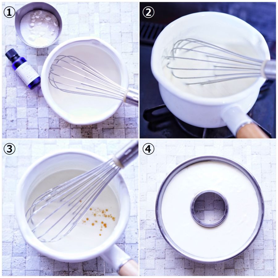 ④さっと水に通したエンゼル型に流しいれ、粗熱がとれたら冷蔵庫で1時間以上冷やし固めます。