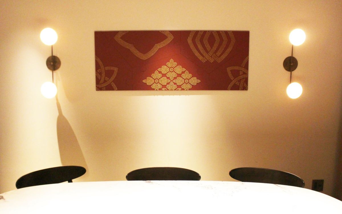お部屋に飾られているこちらのアートも、地元の家紋職人さんが「NOHGA HOTEL UENO TOKYO」のためにオリジナルでデザインした作品。鋲をひとつひとつ打って手作りしている一点物で、この部屋でしか見ることができないのだとか。