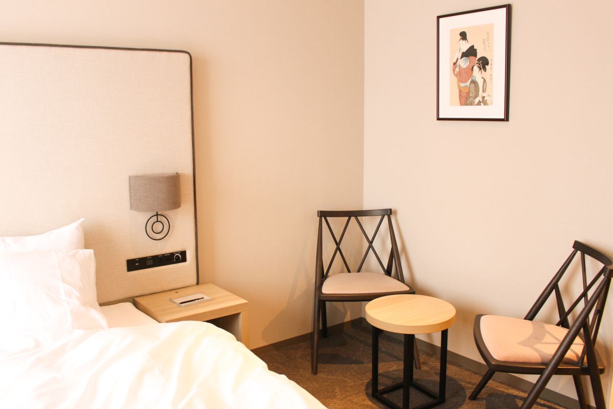 ベッドの横にはテーブルと椅子が。ここでお茶を飲んだり、近くで購入した食べ物を食べたり…。壁にはお部屋ごとに異なる絵が飾られていて、お部屋でもアートを感じることができます。来るたびにどんな作品に出合えるのか楽しみになりますね♪