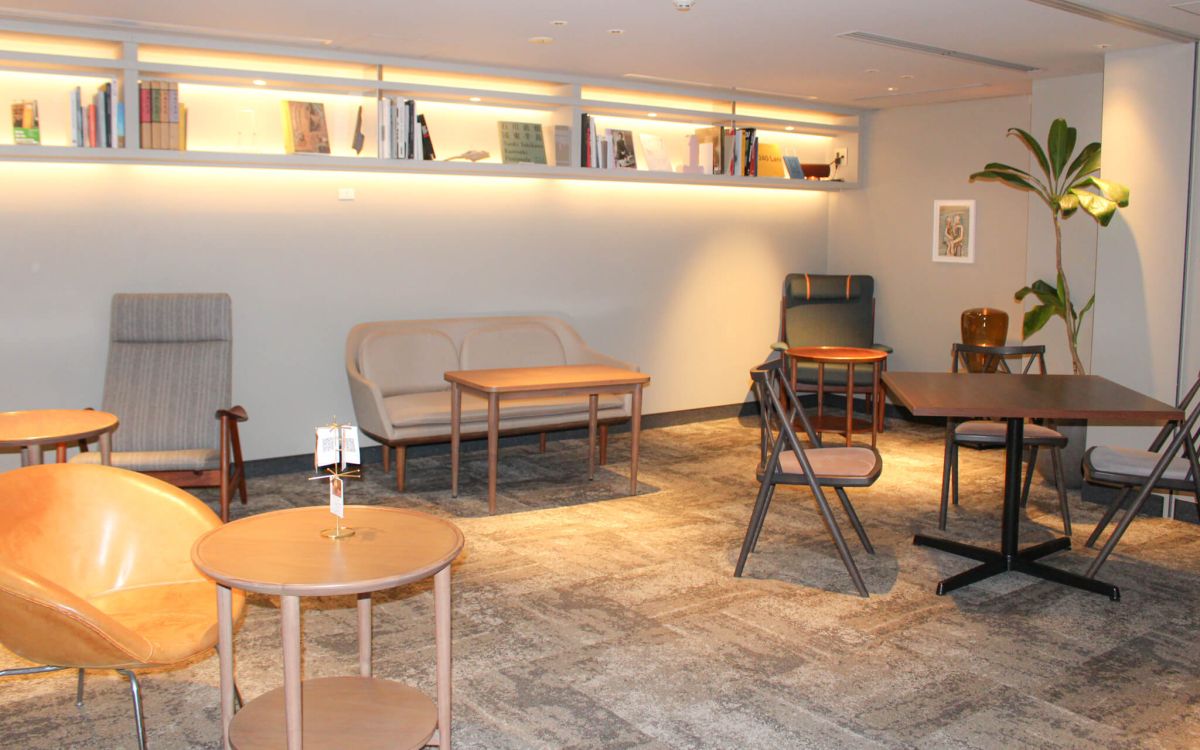 2階のライブラリーラウンジは、ゆったりくつろげる椅子とテーブルが配置されており、休憩したり読書をしたり、リモートワークをしたりとさまざまな用途で利用できるパブリックスペース。