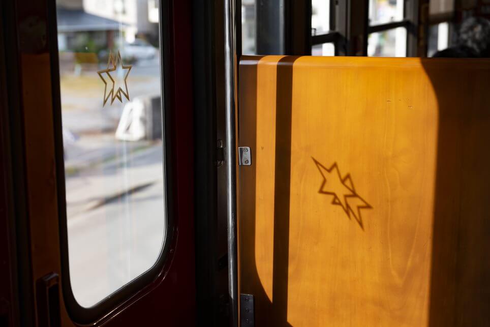 車両の外観は、有明海・大村湾の水面に映える“パールメタリック”を基調としたデザイン。キラリと輝く金色のラインがレトロでカッコいい!