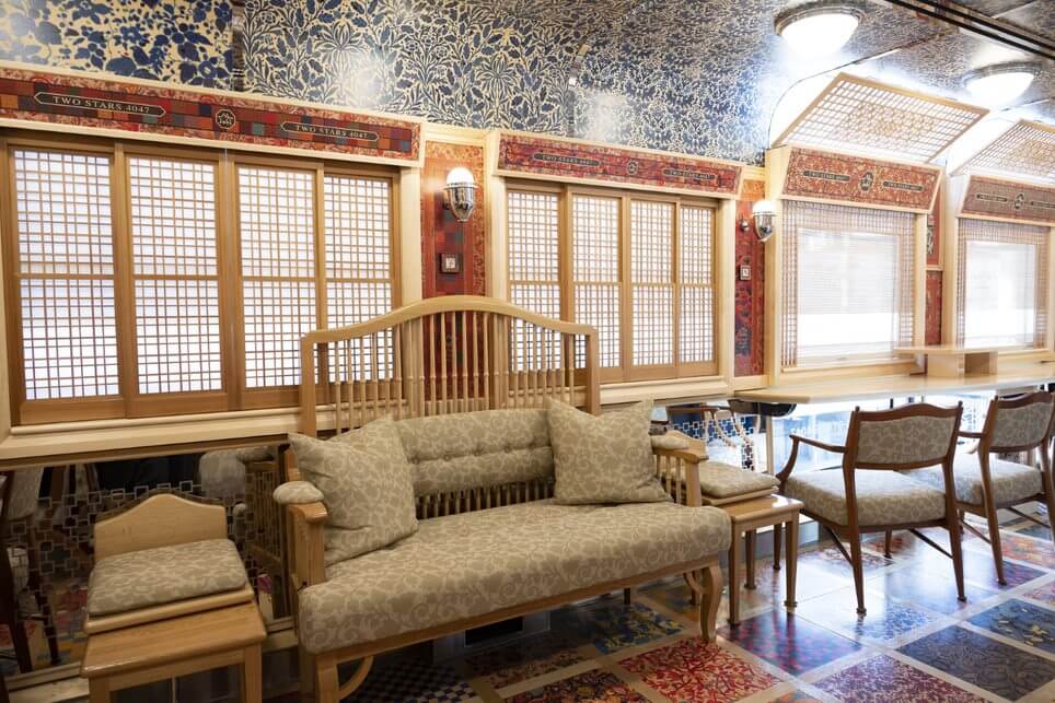 壁や床は、草花がモチーフの木版で彩られ、窓枠には障子、重厚な造りのソファや椅子なども置かれ、車内を彩るゴージャスなあしらいが非日常感を演出しています。