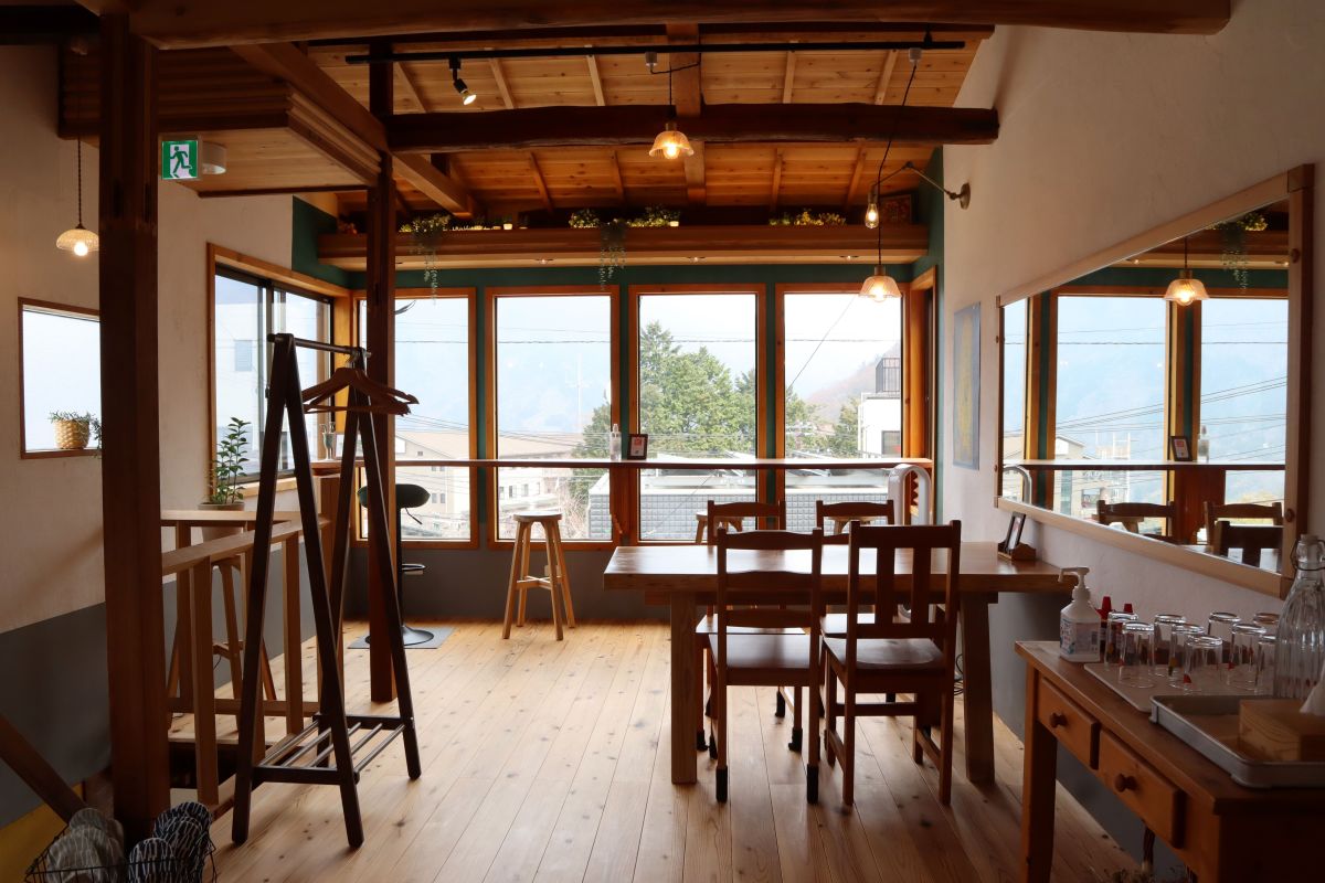 注文と支払いを済ませたら2階へ。靴を脱いでリラックスできるスペースです。まず目に飛び込むのは、窓の外に広がる箱根外輪山!小涌谷にこんなビュースポットが?と驚き。