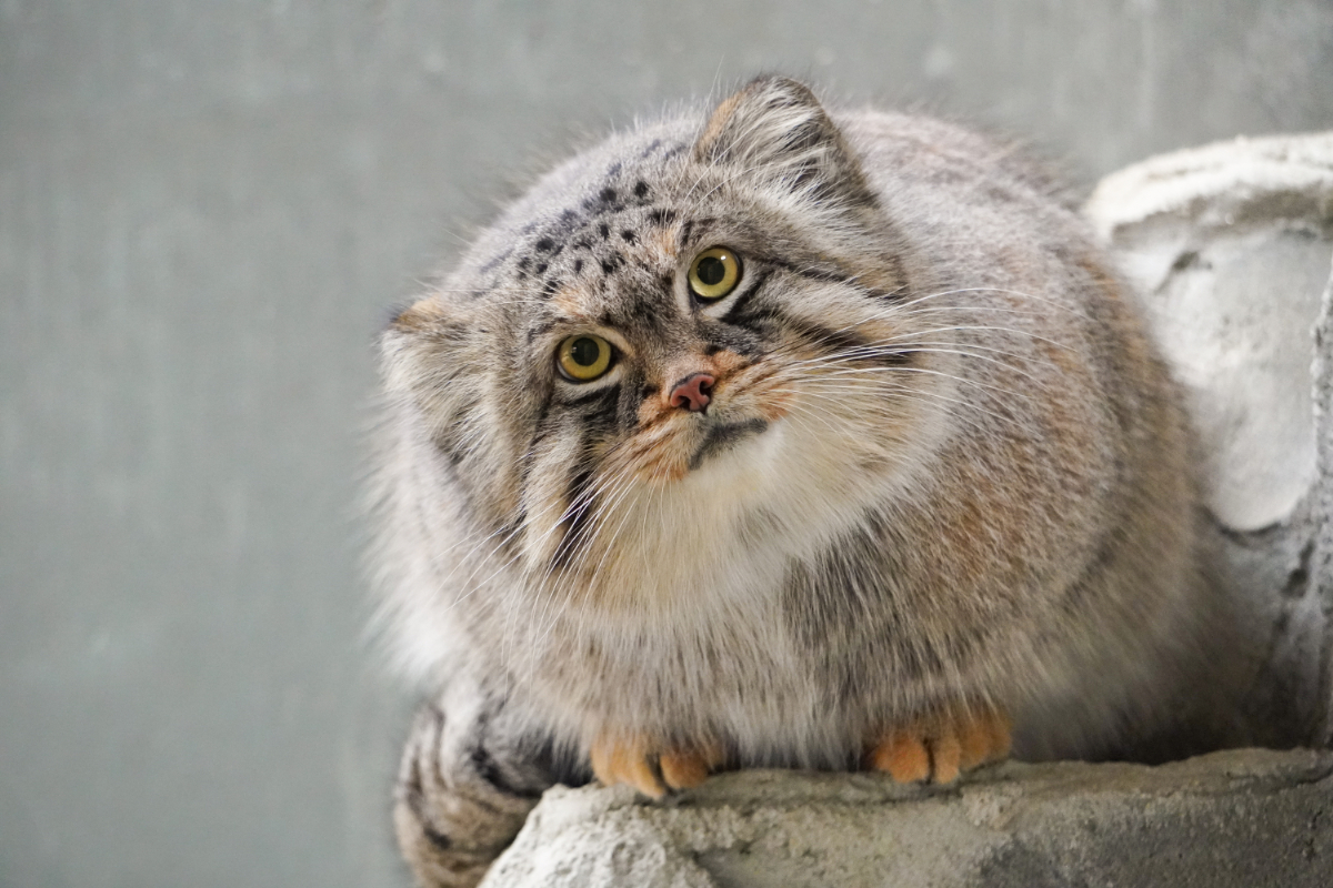 「マヌル」はモンゴル語で「小さい野生ネコ」の意味。岩場に住むマヌルネコにとって灰色の毛色は保護色となり、身を隠すことに役立てています。標高の高い大草原や岩場で過ごす野生のマヌルネコは速く走るのが苦手で、できるだけ獲物に近付き静かに気配を消して狩りをするそう。園で飼育されているマヌルネコは、飼育員の様子をうかがうときなどに見られる、しっぽを高く上げゆらゆらと動かす仕草がキュートです。