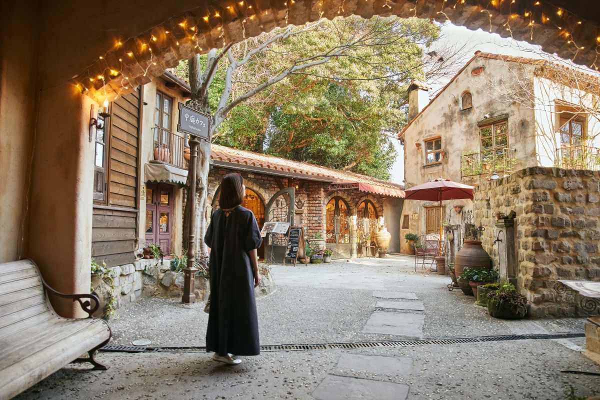 施設内には「森のチーズケーキやさん」やアロマ、ハンドメイド雑貨などを販売するショップも点在しています。これらのショップがあるエリアへの入口はアーチ状の門で囲われていて、別空間に入り込む瞬間のような写真が撮れますよ。アーチの上に灯されたライトも写真に一緒に入れると、より幻想的な写真に。人物越しにかわいらしい建物を撮ってみて!