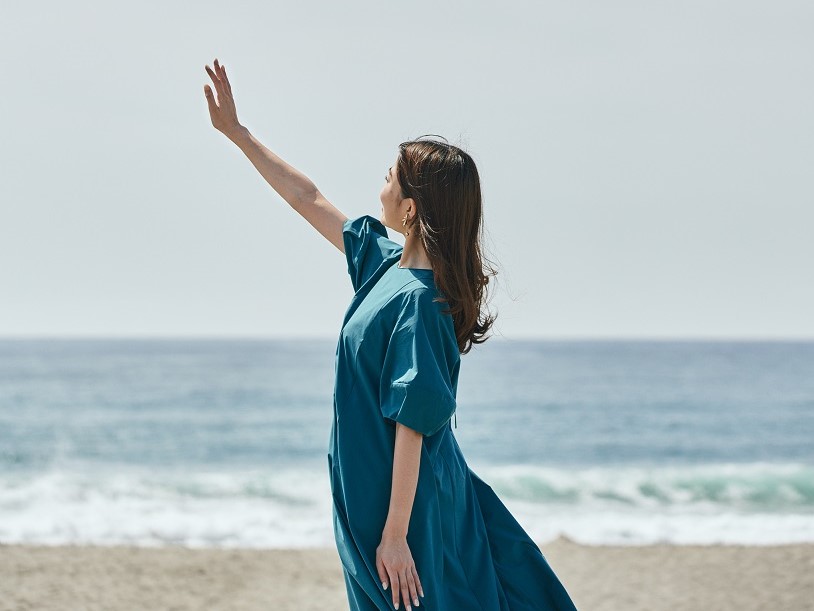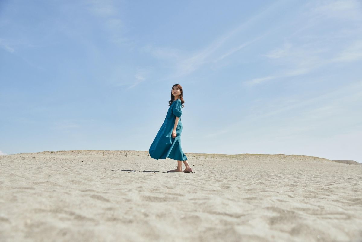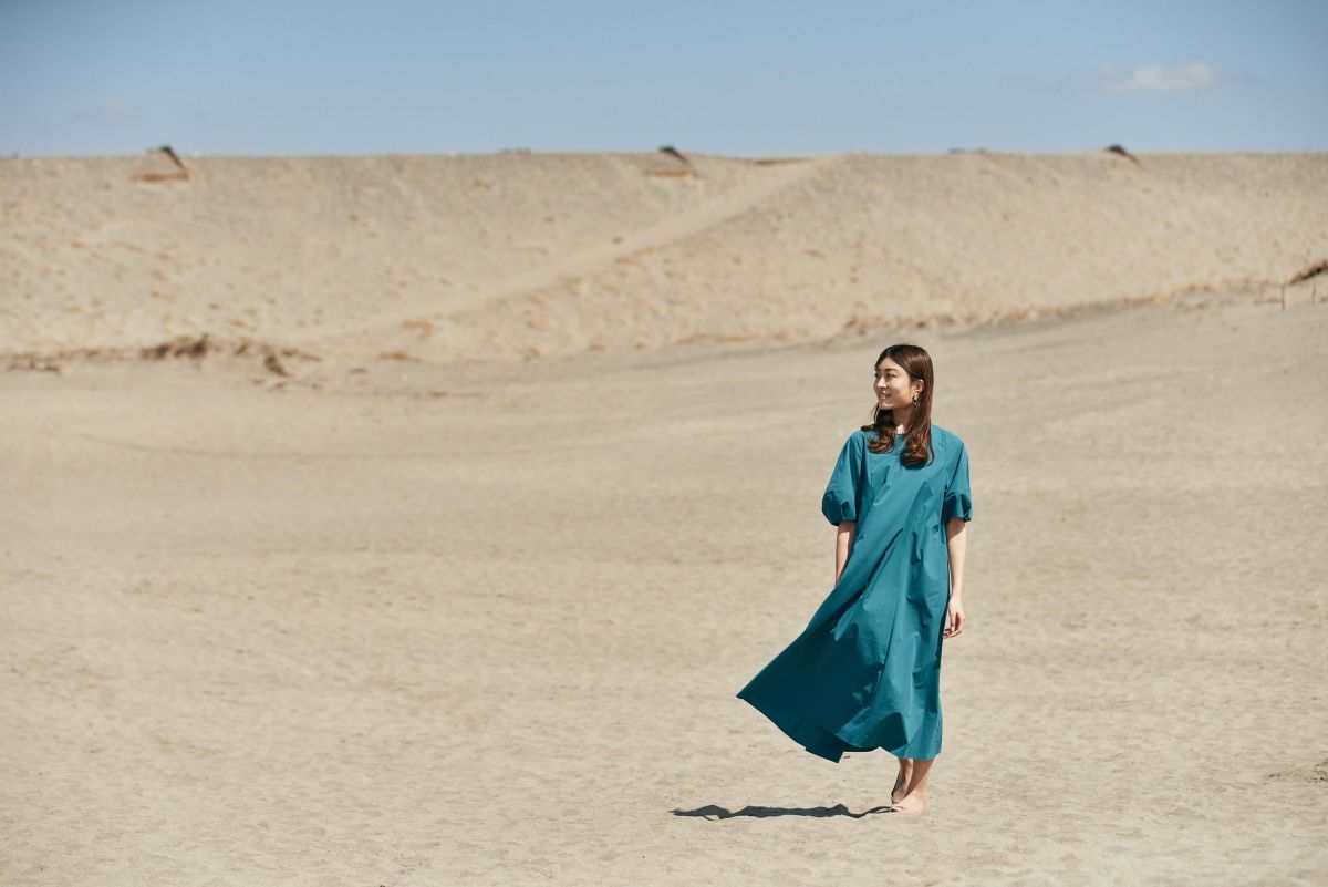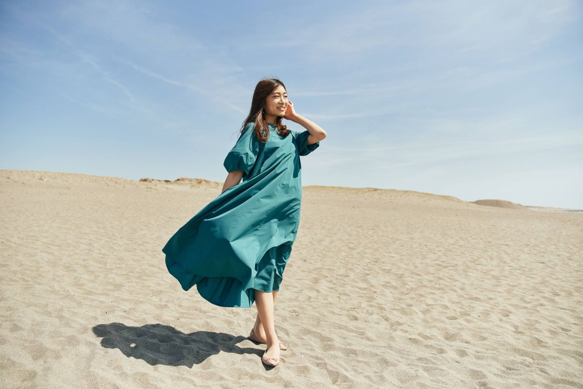 砂地が広がる砂丘では、色味のある服で写真を撮りたい!こちらのワンピースはグリーン色が鮮やかで、単調な色のスポットでも写真に映えます♪「ぬくもりの森」で着用したワンピースと色違いのワンピースで、こちらも撥水、軽量で蒸れにくく接触冷感機能付き。テロンとしたシワの付きにくい素材で、旅行先に畳んで持っていってもシワを気にせずさっと着れるのがうれしいポイントです!