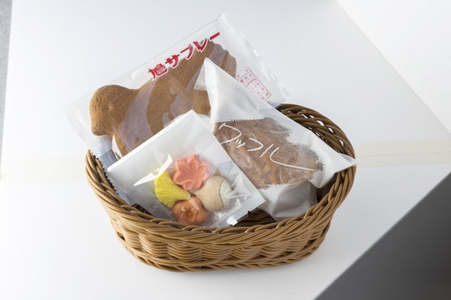 「鳩サブレー」122円を1枚から買えるのもうれしい♪ さらに瀬戸小路限定の「御干菓子」180円や、戦前から豊島屋の定番であるあんずジャム入りの「ワッフル」220円も購入できる。