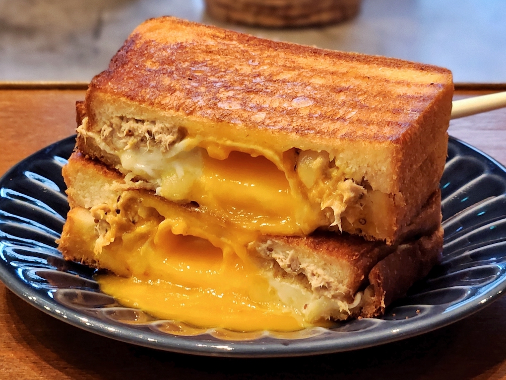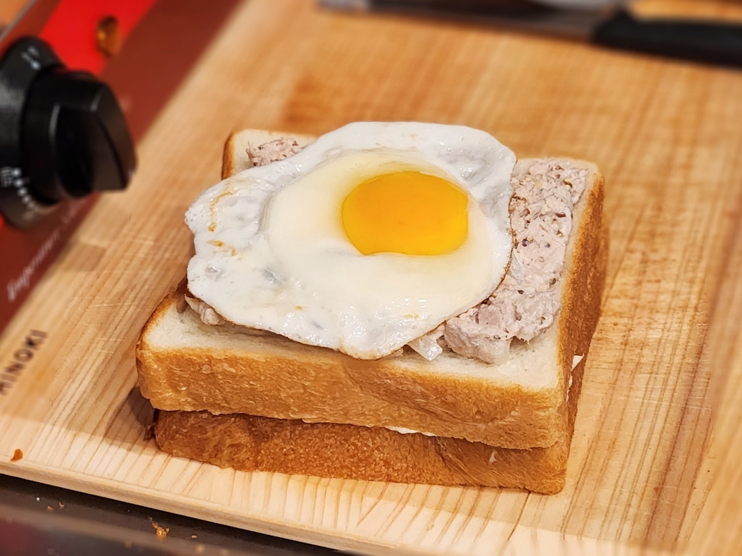 たっぷりのツナと玉ねぎとチーズの上に、焼きたて半熟の目玉焼きを乗せてパンで挟みます。