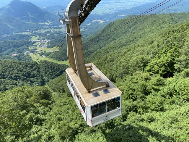 信州中野ICから16km、鉄道でも長野電鉄長野線湯田中駅からシャトルバスが運行しており、車、公共交通の両方でアクセスできる「竜王マウンテンリゾート」。麓に到着したら、雲を突き抜ける体験が楽しめる「ロープウェイ」に乗って山頂へ向かいましょう。標高1770mのロープウェイ山頂駅まで約10分間の空中散歩です。
