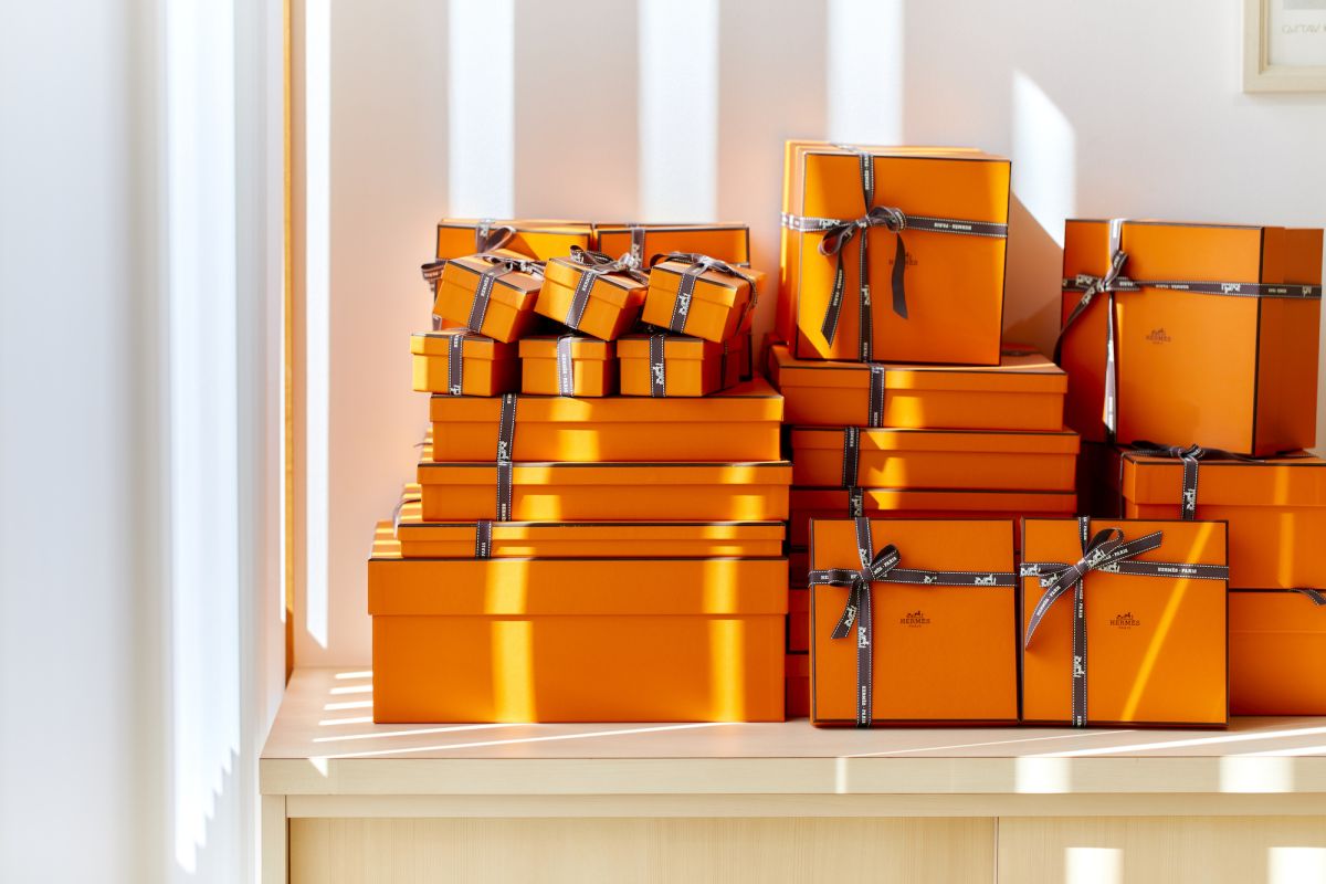 華美すぎないシンプルで上品なインテリアの中、一際目を引くのがオレンジ色のエルメスの箱。