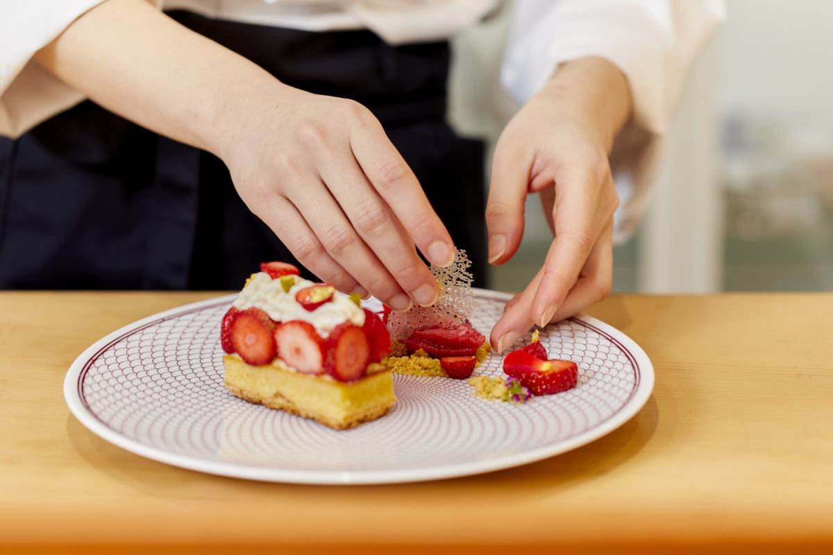 たとえば冬から春にかけてあらゆるスイーツの主役になるいちご。ケーキに使うときには、和食の隠し包丁の技法を用いることでクリームやスポンジとよりしっくりと調和するそうです。
