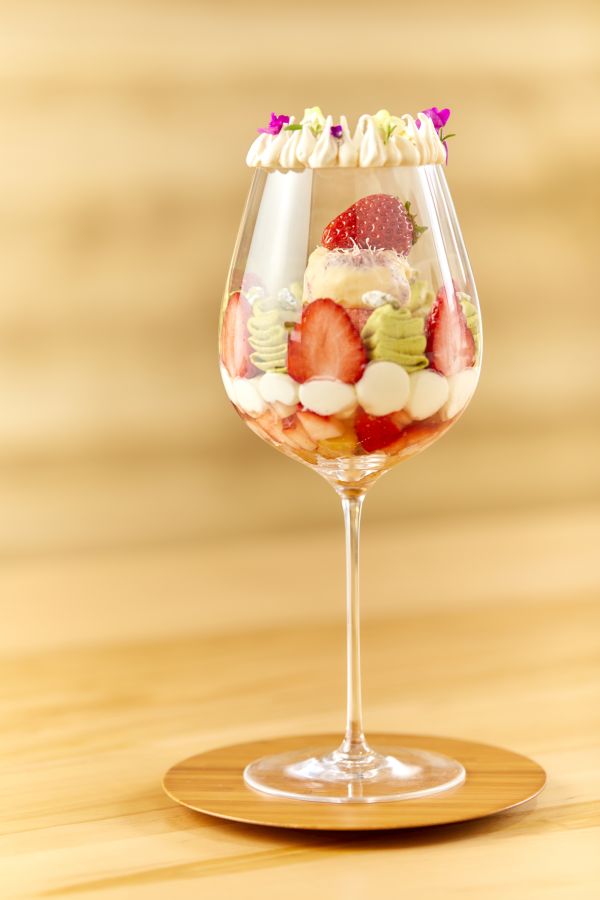 話題のワイングラスパフェでも季節の移ろいを感じさせてくれます。グラスの中で美しく並ぶいちごやピスタチオのクリームに、メレンゲの冠をのせておめかしした「苺とピスタチオのパフェ」は12月から2月頃にかけて登場する季節のパフェ。