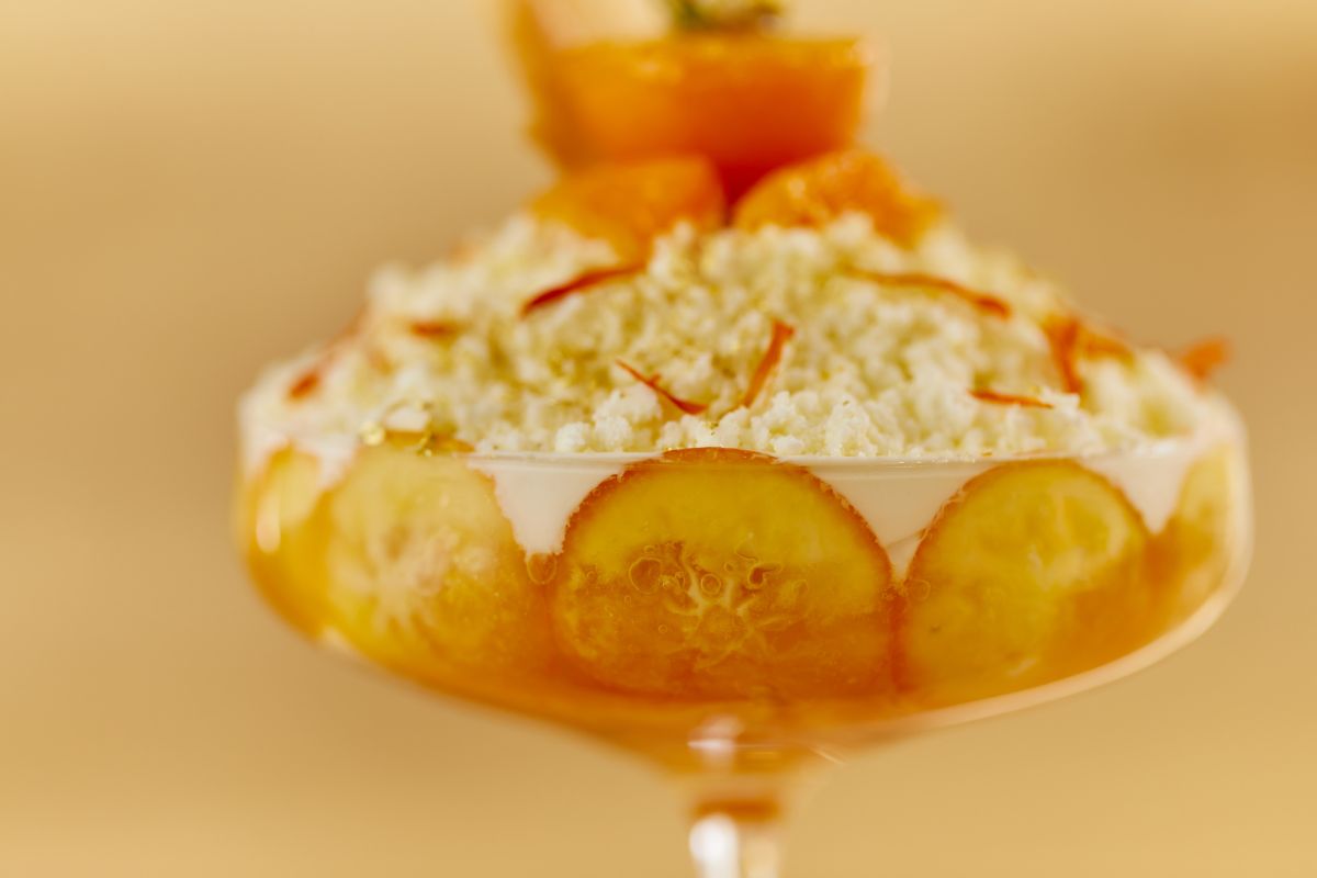 みずみずしい甘さの愛媛県産せとかと宮崎県産金柑たまたまを主役に、蜂蜜のクリームとレアチーズのクリームが包み込みます。玉雪のようなヨーグルトアイスの粒を降らせた頂上には、金柑の皮のコンポートを器にしたクリームブリュレが鎮座します。添えられたオレンジのソースはお好みで。