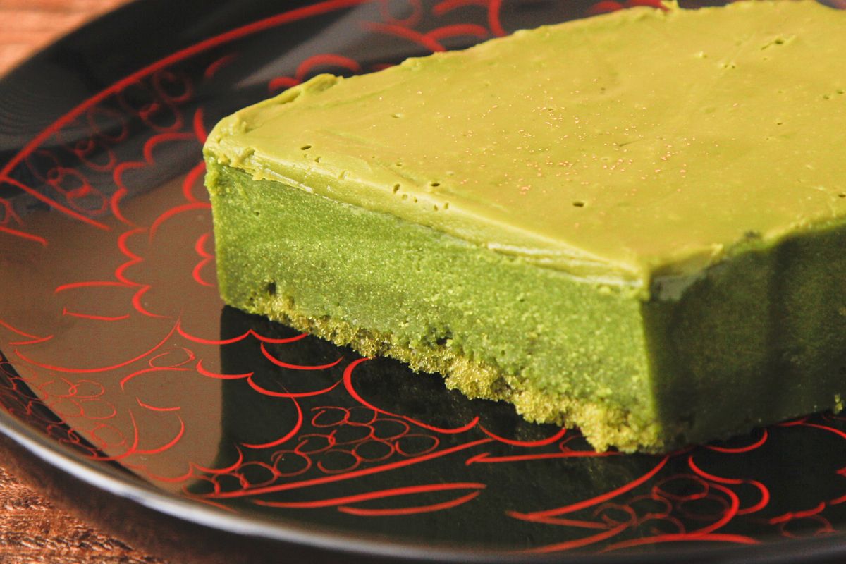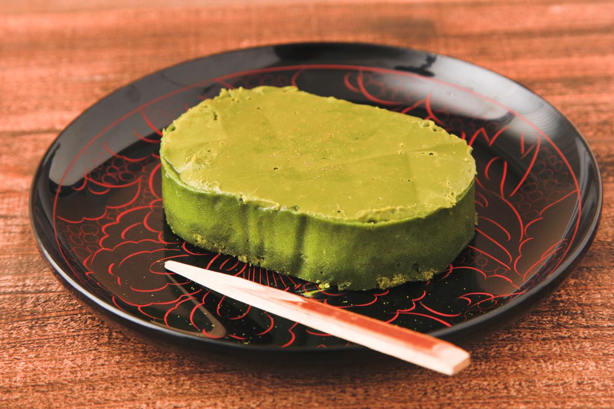 表面は抹茶チョコレートコーティング、中はねっとりとした抹茶テリーヌ、底の部分は抹茶が染み込んだスポンジと3層仕立て。少しずつ食感が異なりますが、濃厚な抹茶の風味で一体になっています。