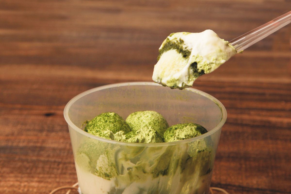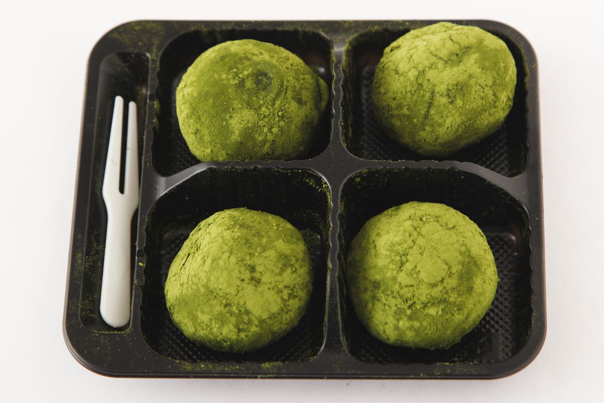 マリモのように見えるのは、餅生地の外側に抹茶パウダーがしっかりとまぶされているから。お餅に十分にまとわせることで、口に含んだ瞬間から京都産宇治抹茶の豊かな風味をしっかり感じられるようになっています。