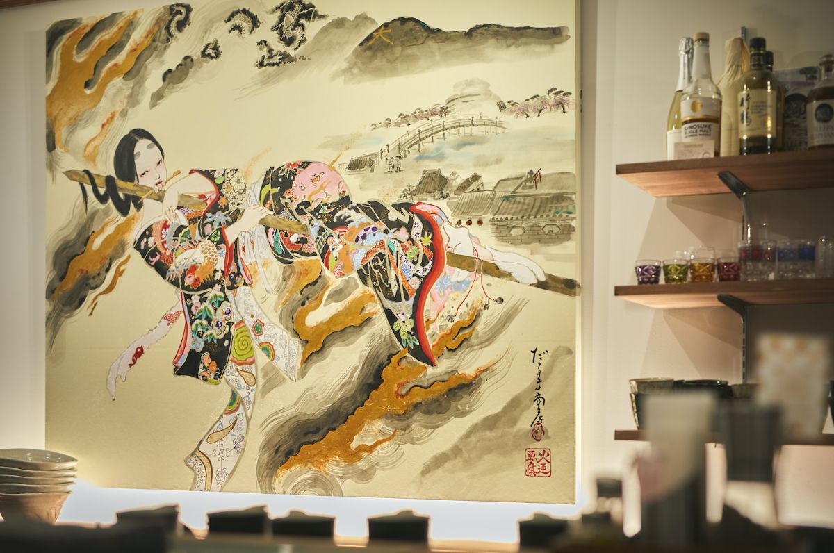 カウンター席に座ると、目の前にある精細な絵。こちら随心院の『極彩色梅匂小町絵図』で有名な「だるま商店」が串焼きショパンのためだけに描いたもの。よくよく見ると、絵柄のなかにバッテリーを組んでいたというオーナーの若き日の姿が隠れていますよ。