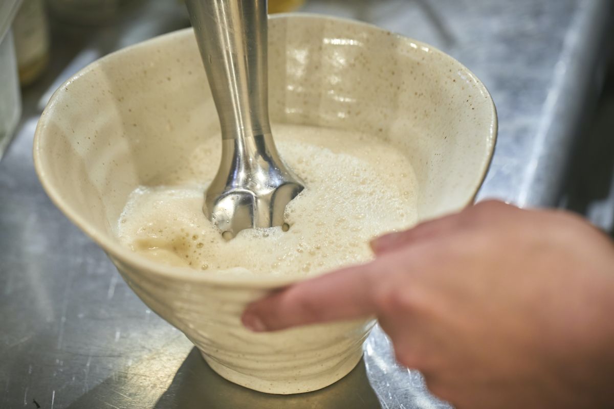 さっそくですが、泡のラーメンです。作る様子を見せていただくと、なんとハンドブレンダーの登場です。泡立つ理由は企業秘密ですが、こちらのラーメン、化学調味料は無添加。からだに悪いものはいっさい入りません。