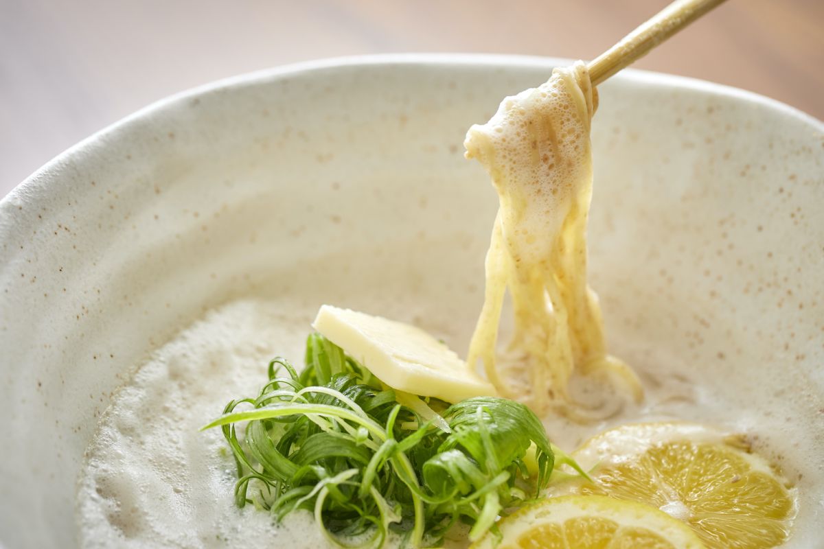泡の上にスライスレモンとバターをトッピングした「Lemon バター鶏そば」。国産鶏100%の鶏白湯スープの旨みをストレートに楽しむスタンダードメニュー「THE鶏そば」にレモンで清涼感、バターでこっくりとしたコクを追加。