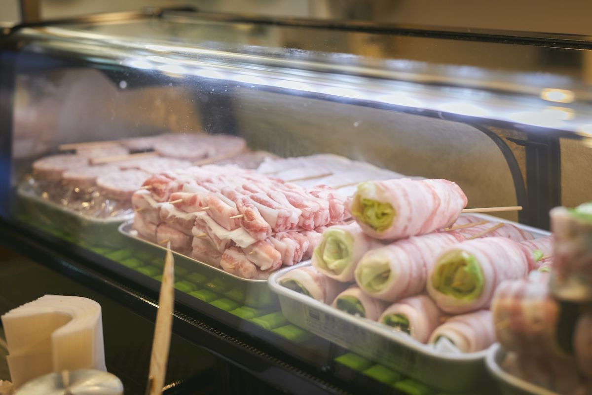 ラーメンの営業が15時で終わったら一度店が閉まり、17時から串焼きの時間が始まります。ショーケースに行儀よく並ぶのは、看板メニューの野菜串。