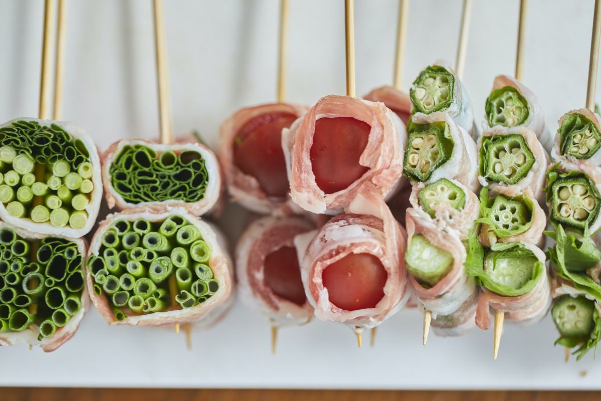 断面萌え!な野菜串いろいろ。青ネギ、ミニトマト、オクラ、レタス、豚バラと玉ねぎを交互に刺したミルフィーユなど、見た通り野菜が主役。
