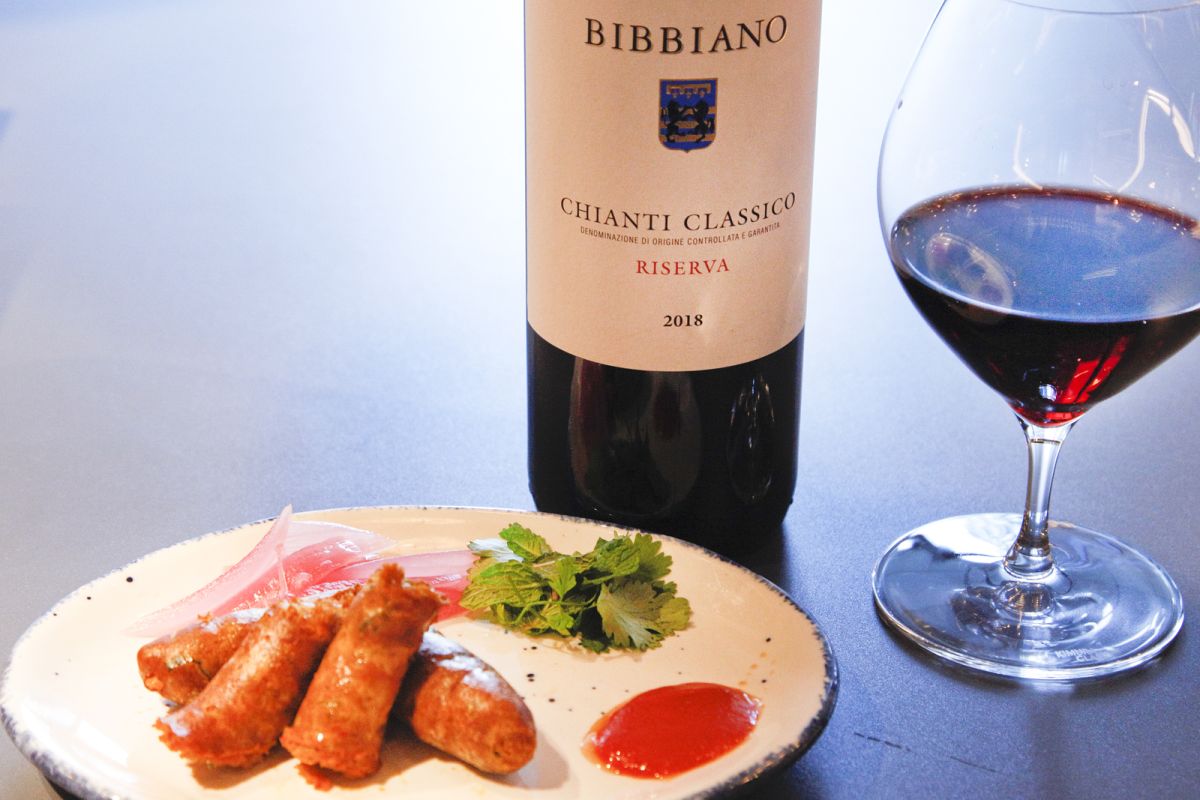 約20種もの香辛料が使われているというスパイシーな「ベトナムソーセージ」880円と今回合わせたワインは、イタリア産赤ワイン「ビッビアーノ キャンティ・クラシコ・リゼルヴァ」グラス1200円/ボトル6600円。ややコクと厚みのある赤ワインが、パンチのあるソーセージの旨味を引き立てます。
