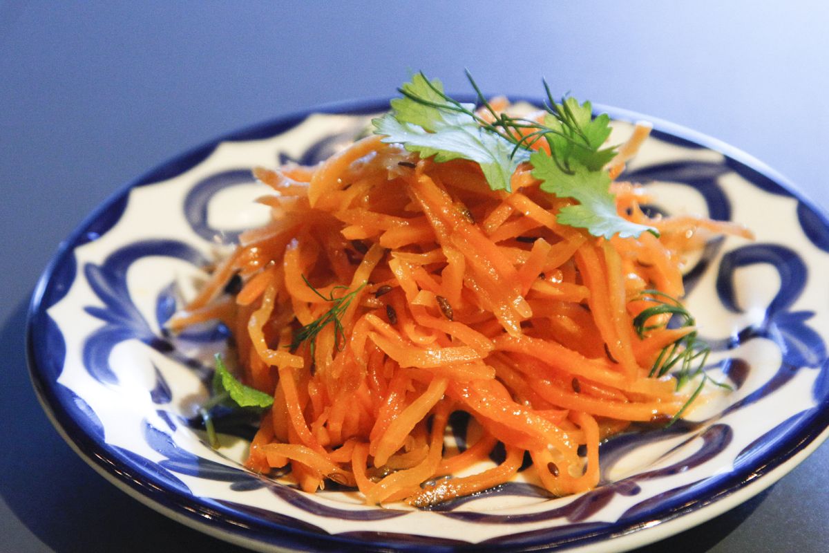 「キャロットサラダ ニョクマム風味」770円。ベトナムの魚醤“ニョクマム”でエスニックに風味づけされているのですが、上品な味わい。シャキシャキの食感で、ドライな白ワインと好相性です。