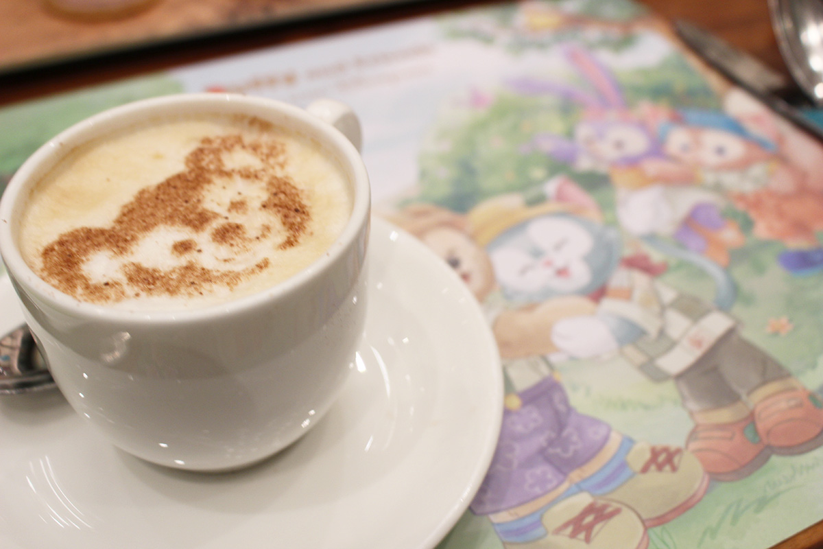 セットでコーヒーもしくは紅茶のドリンク付き。注文したホットカフェラテはダッフィーのアートが施されていてとってもキュート!