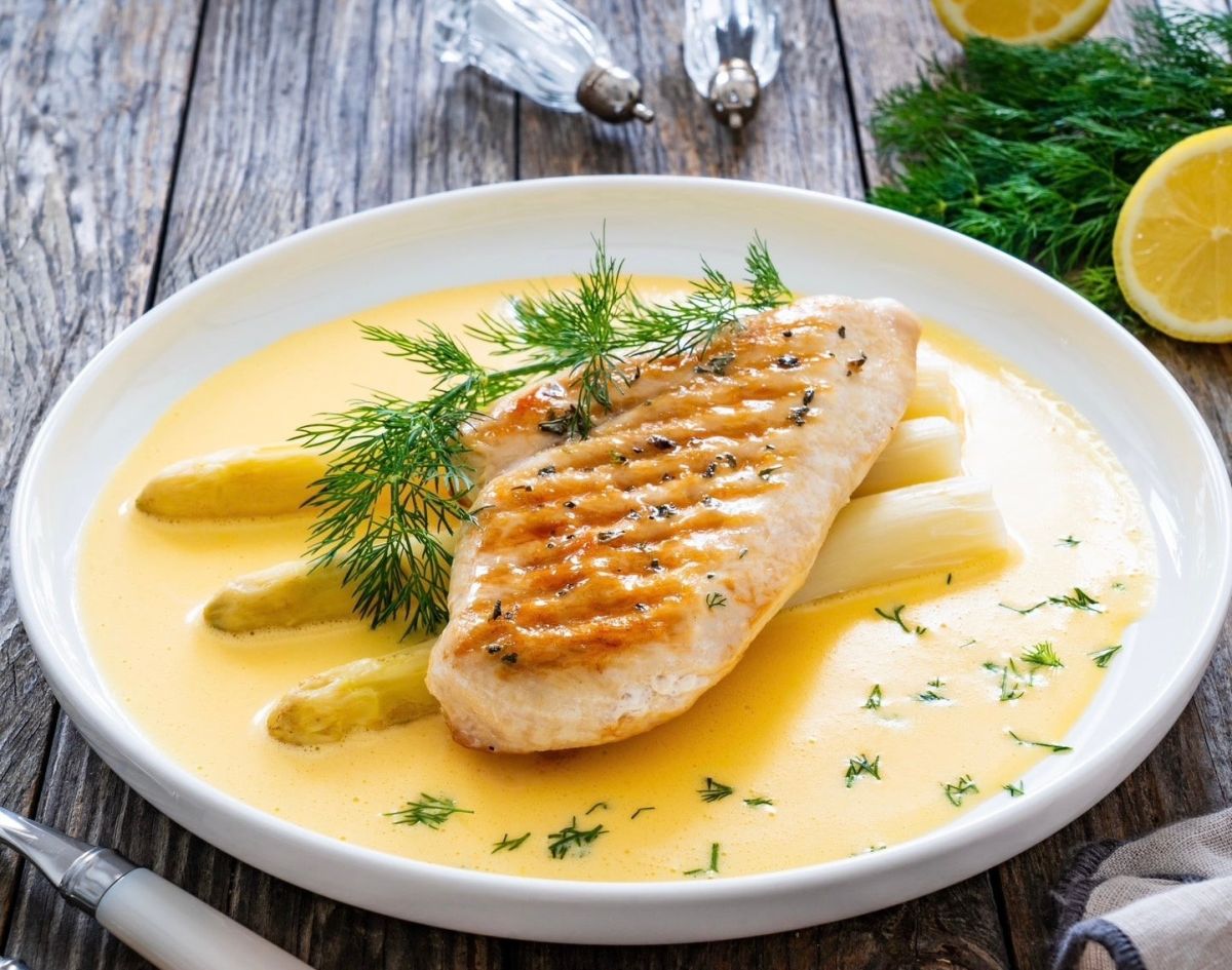 ドイツの春野菜を代表するホワイトアスパラガスと白身魚を添えた一品。