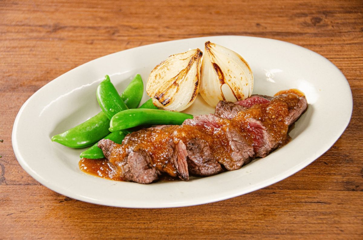 お店名物の「やわらかリブステーキ」と「春野菜のグリル」を楽しめる特製メニュー。玉ねぎ、スナップエンドウの春野菜と自家製オニオンソースでいただきます。※仕入れ状況により春野菜の種類が変更になる場合がございます。