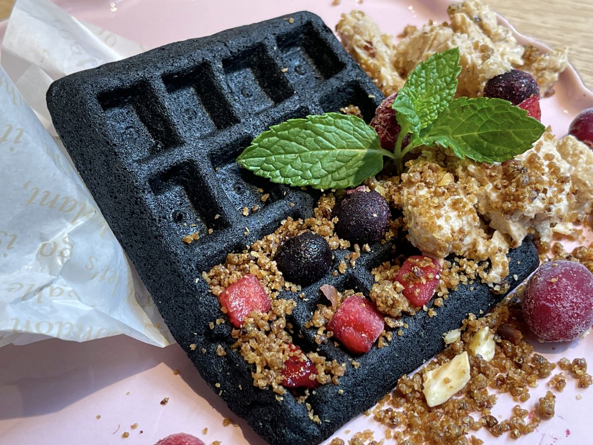 真っ黒な見た目がインパクト大な「炭の米粉ワッフル」。上にはミックスベリーと、オーガニックの米ぬかで作られたグラノーラ、無調整豆乳とオーガニックデーツを使用したアイスが乗っています。