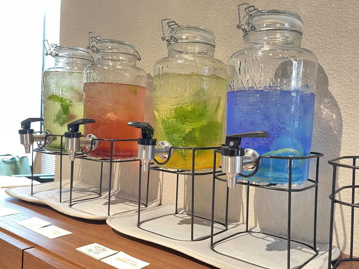 無料で飲める、セルフサービスのデトックスウォーターもおすすめ。