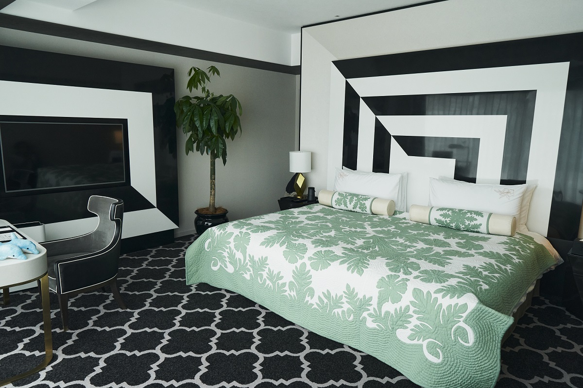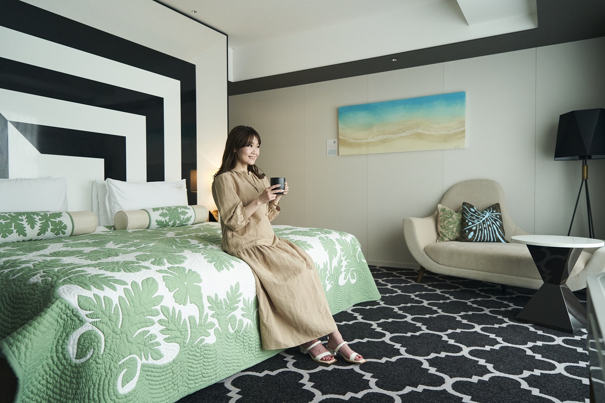14階のロビーに上がると、トライバルデザインというポリネシア由来の幾何学模様とハワイアンキルトの柄が合わさった、ここにしかない空間が広がり、一気に旅行気分が上がります!ラウンジでハワイ伝統の味「シンパンケーキ」を味わったり、ブティックでマカダミアナッツを購入したり、それだけでもちょっとしたリゾート気分を味わえますが、今回は限定5組のゲストルーム「Feel ALOHA ! Hawaiian Package Room」で、思いっきりハワイ気分に“浸る”ことに。