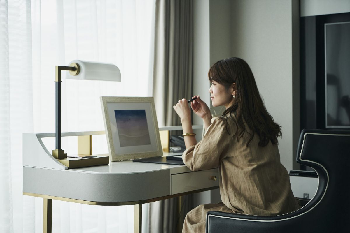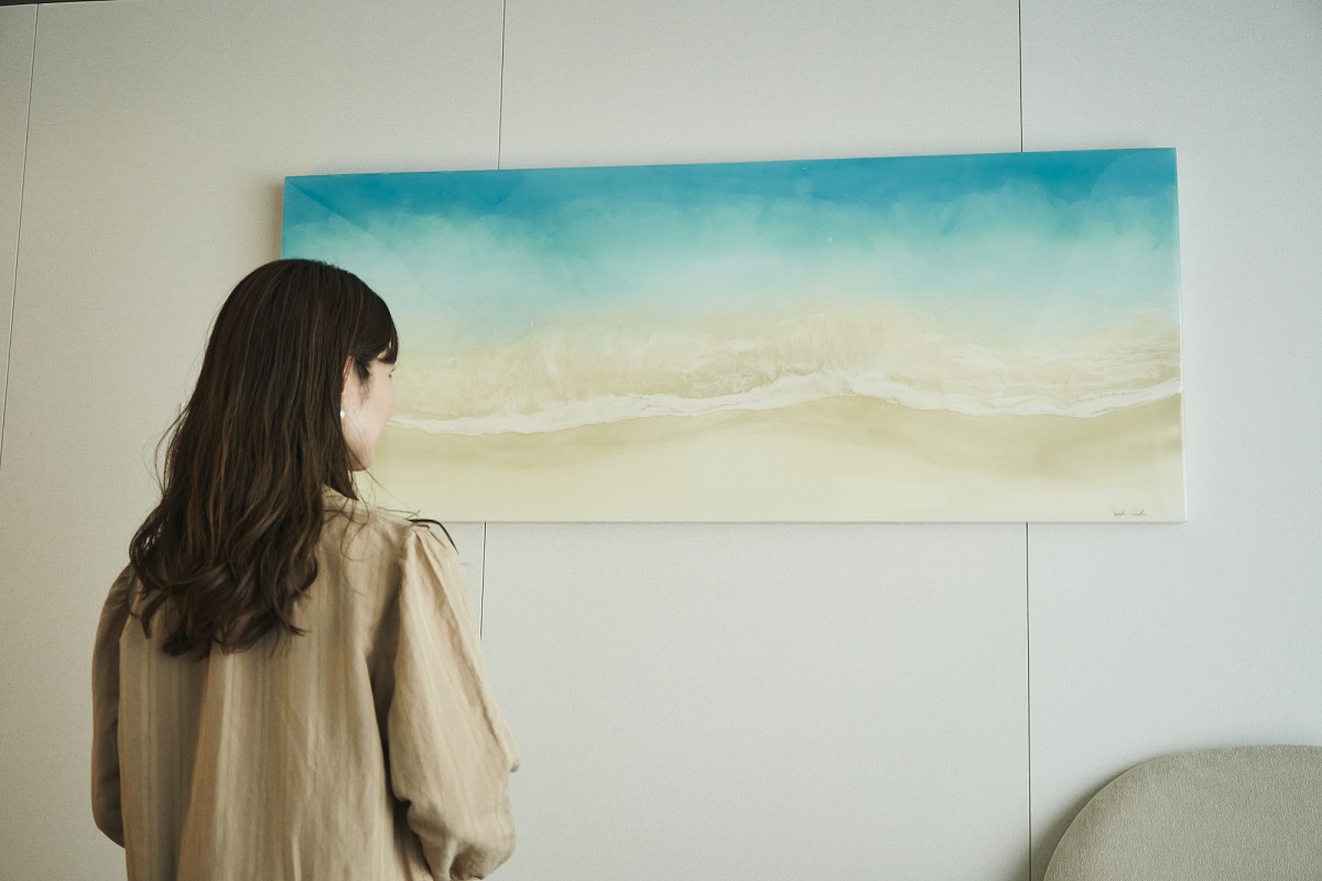 「Feel ALOHA ! Hawaiian Package Room」は、ハワイのトップアーティスト10人に選ばれたサラ カードルさんとのコラボレーションルームで、部屋の壁には、サラさんがレジン(樹脂)を一層ずつ丁寧に重ねて描いた、立体感と透明感のある宝石のようにキラキラしたハワイの風景画が飾られています。そのなかでも1236号室と1237号室に飾られるのは、日本でたった2枚しかない原画なんです!