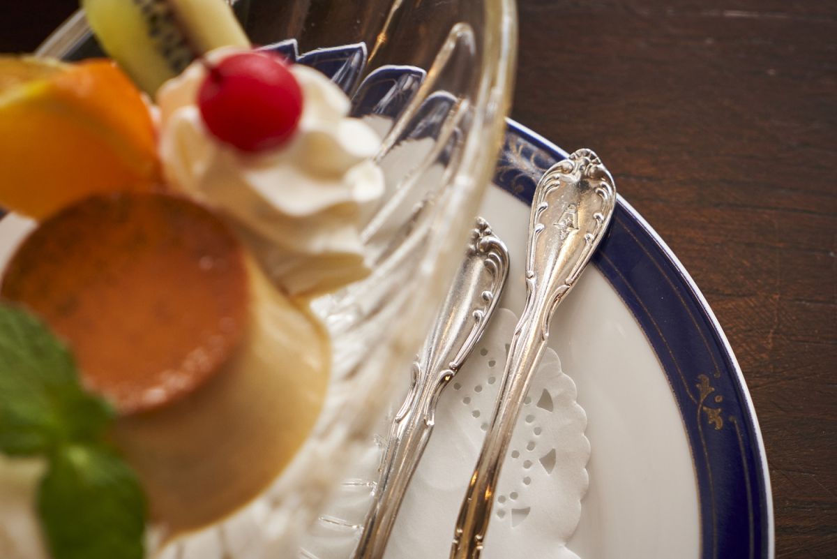 このお店に来たらマストで注文したいのが「プリン・ア・ラ・モード」。濃厚な卵の風味を口いっぱいに味わえる一品です。ガス灯のマークが入った銀食器のスプーンとフォークでいただきます。細部までこだわったレトロな雰囲気がたまりません。