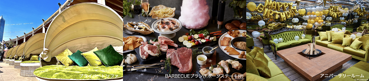 東京・新宿の「ルミネエスト新宿」の屋上に2023年4月17日(月)にオープンした「TOKYO SKY RESORT WILD BEACH SHINJUKU」。日本初の「プライベートソファ」や「プレミアムラグジュアリーソファ」「グランピングドーム」など 5つの非日常エリアで、肉厚アメリカン「Tボーンステーキ」BARBECUEなど、多彩なメニューを楽しめます。非日常空間で、友達のアニバーサリーもお祝いできちゃいます!