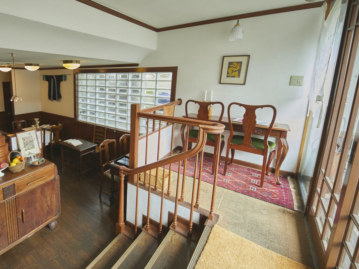 曲線を描く飴色の手すり、階段を下りた半地下の店内、レトロなガラスブロックから差し込むやさしい日の光はそのままなのに、以前のような和の雰囲気はなく、めぐみさんが新しく持ち込んだアンティークの家具が、昔からこの場所にあったかのようにしっくりと馴染んでいます。