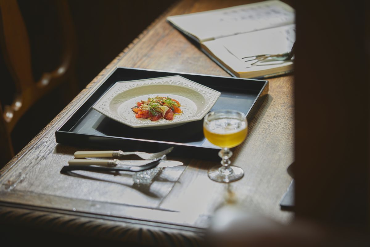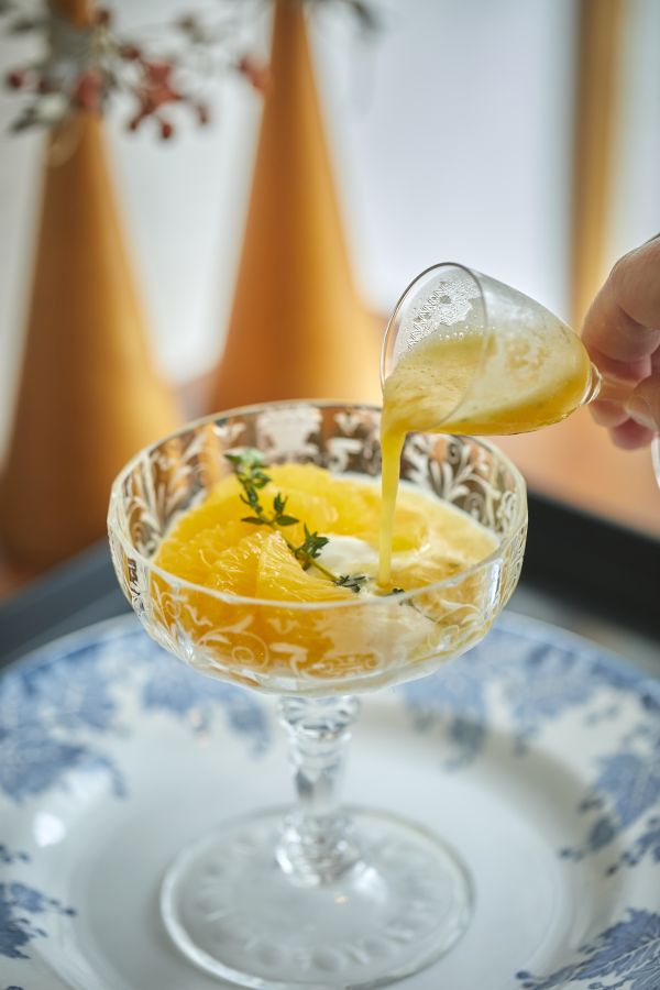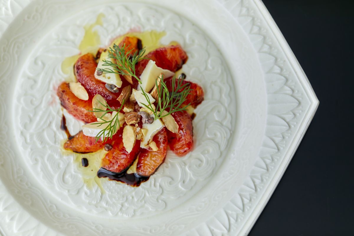 一皿目はブラットオレンジとマンダリンの2種の柑橘が主役。カマンベールチーズとナッツ、ディルを散らし、オリーブオイルと甘味が凝縮された熟成バルサミコで味付けしたサラダ仕立て。柑橘の香りが溶けて、朝のからだが目覚めていきます。
