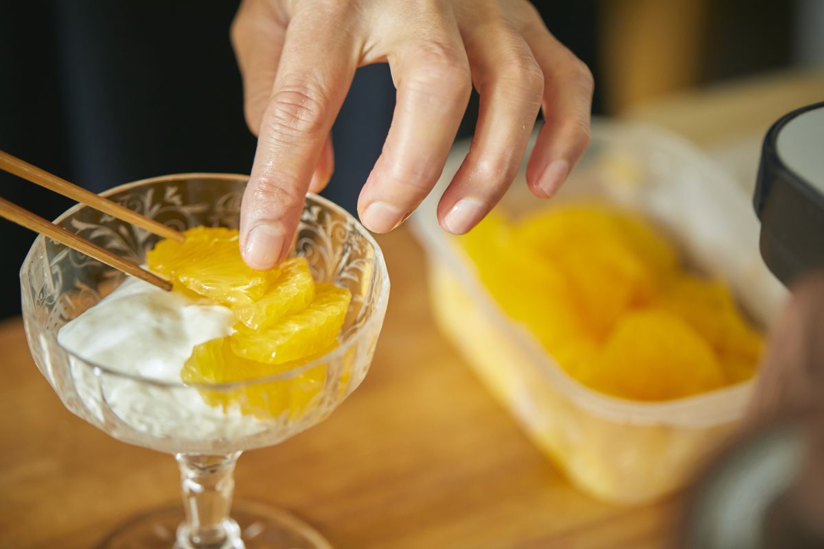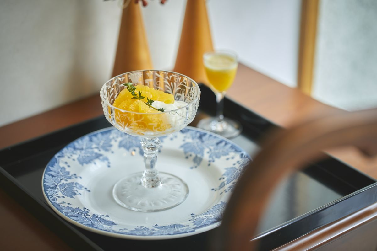 2皿目は、グレープフルーツとはっさくのブランマンジェ。微妙な温度の差で変わるデザートを最良の状態で味わえるようにと、提供前にグラスを氷水で冷やします。