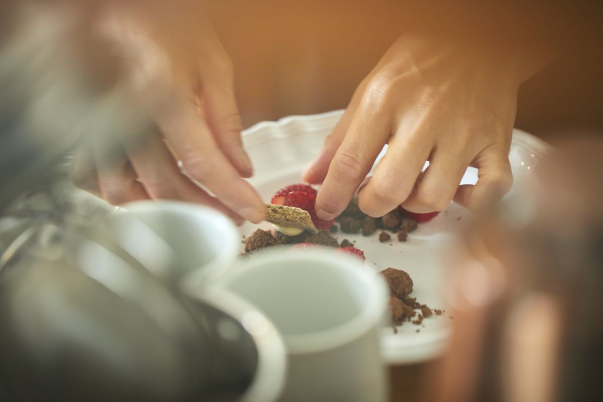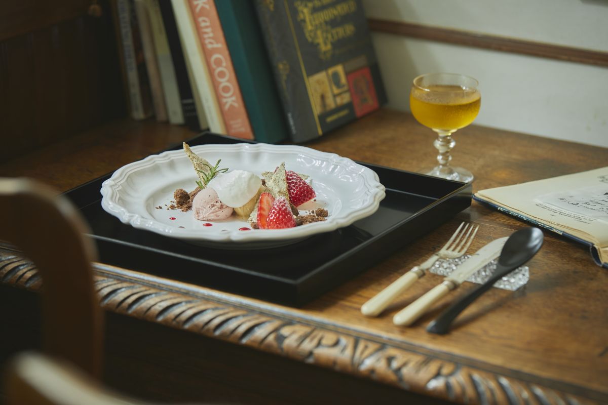 3皿目はいよいよメインディッシュ。いちごの横に立てているメレンゲはアールグレイの茶葉入り。火を入れるというよりは水分を抜くイメージで板状に焼いたメレンゲを割った荒々しさがいちごのかわいらしさをより引き立てます。