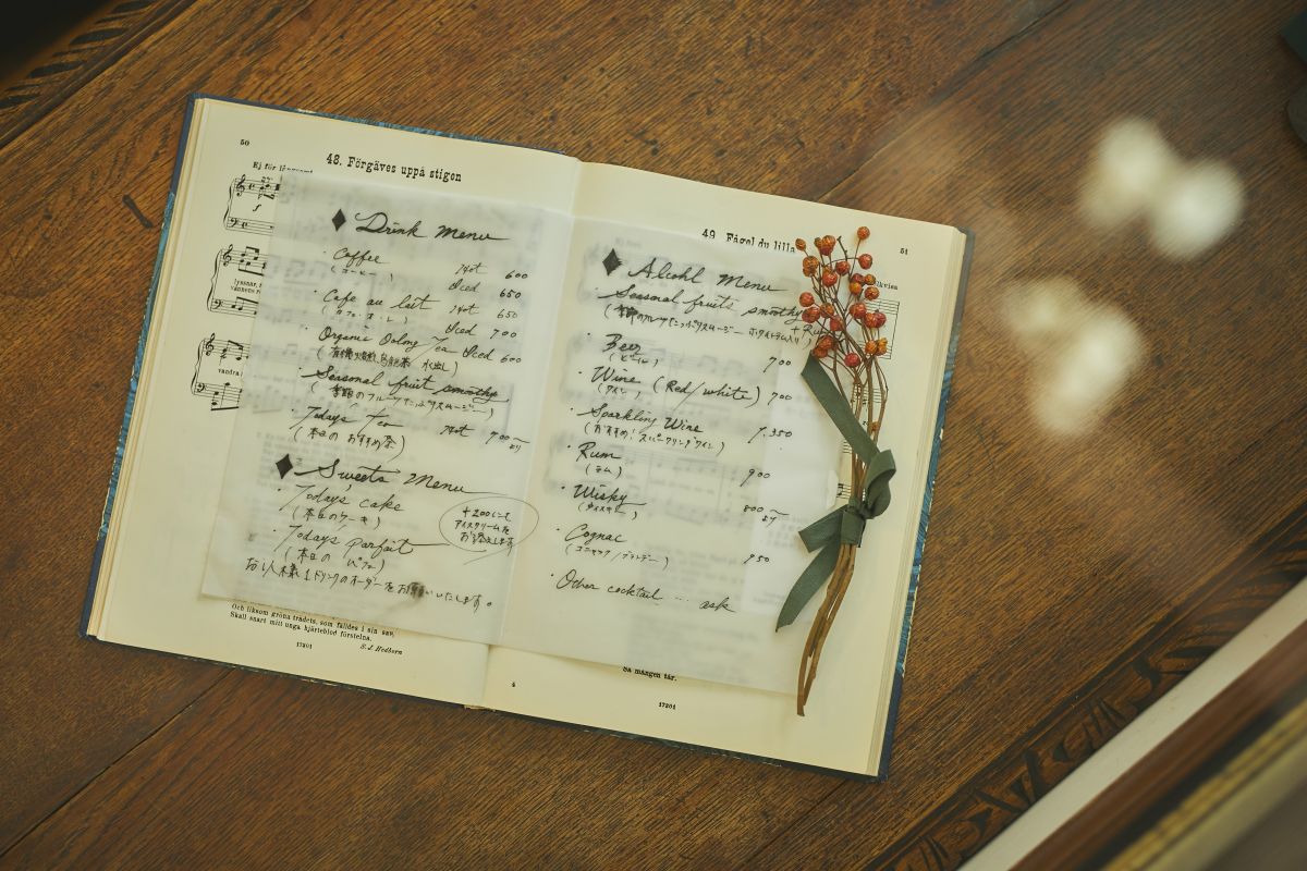 お茶やコーヒーなどはその場で追加オーダー可能。手書きのメニューも素敵です。
