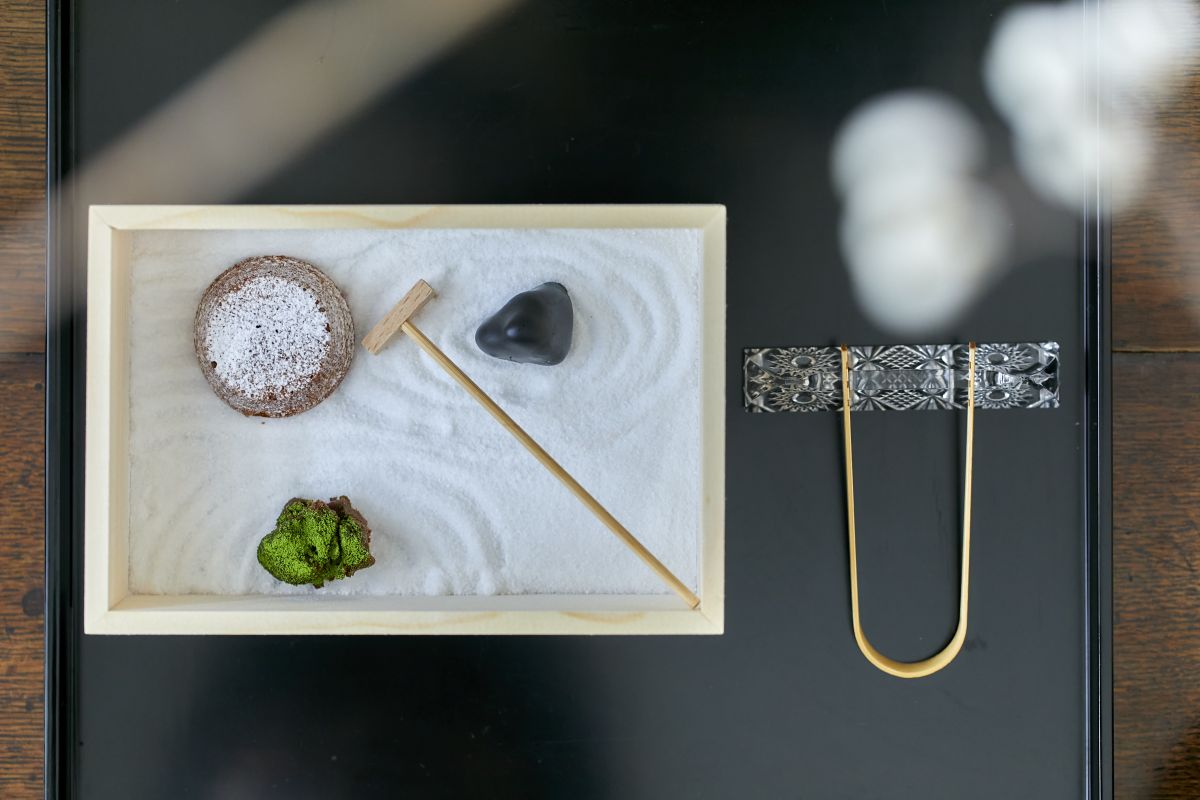 とりを飾るのは、小さな箱庭菓子。蓋をあけるとミニチュアの禅の庭が現れました。