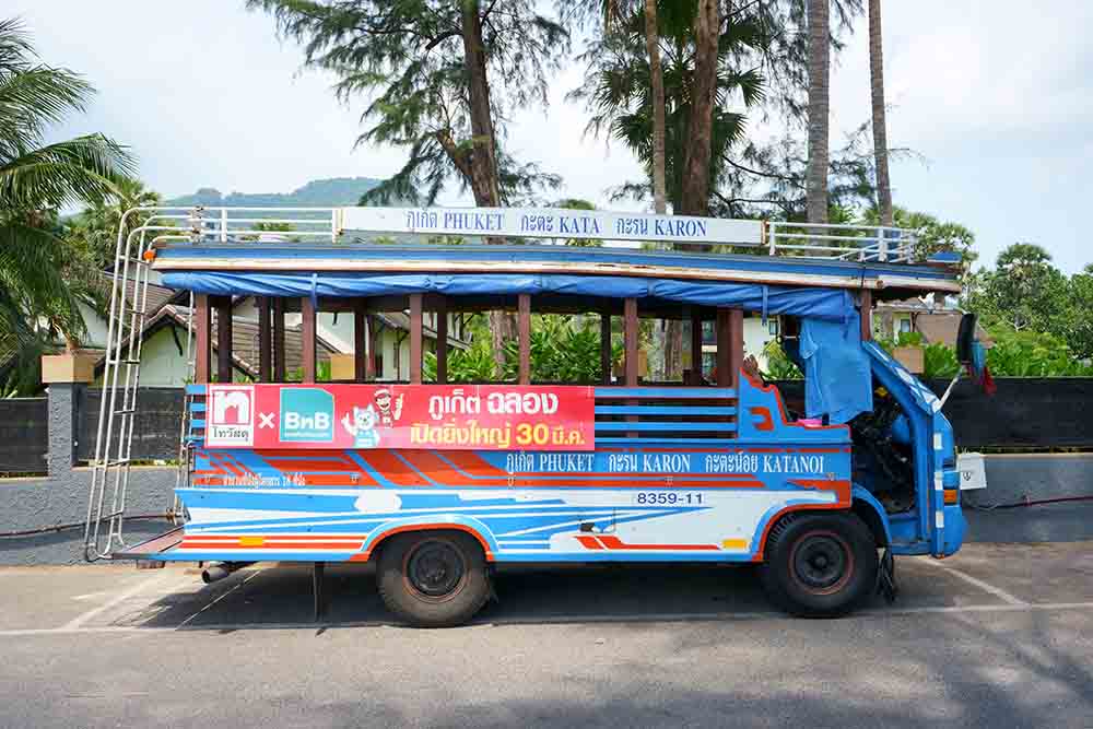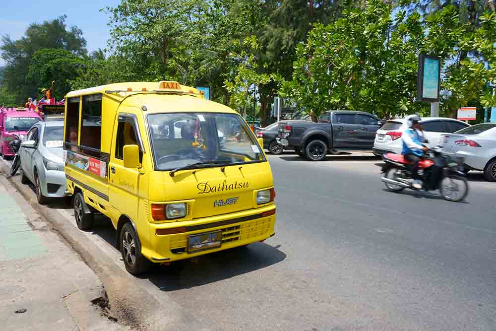 タイの観光に欠かせない交通手段といえば、トゥクトゥクです。トゥクトゥクといえば、原動機付三輪自動車のイメージがあると思いますが、プーケットのトゥクトゥクは小型トラックやワンボックスカーを改造して後ろにシートを付けたもの。料金は交渉制ですが、運転手から割高で提示されることもあるので、事前に相場の料金を調べておいて交渉するのがおすすめです。同エリア内の移動でおおよそB200〜程度が相場です。