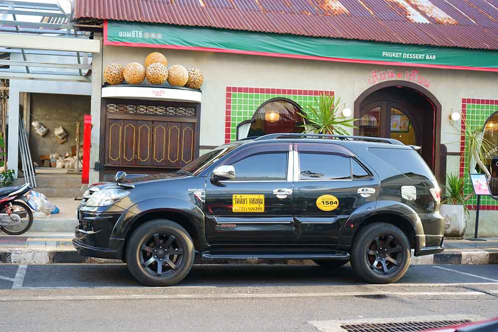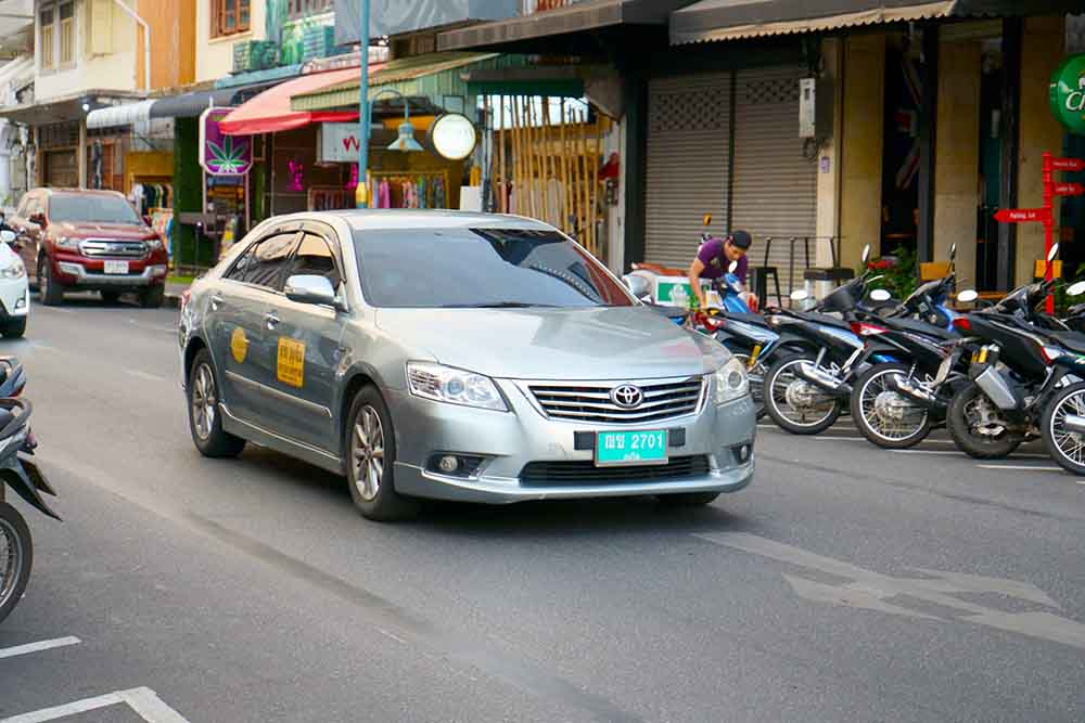 プーケットの観光スポット付近ではよく「タクシー!ヤスイヨー!」などと声をかけられることも多いですが、乗用車タイプのタクシーの場合はしっかりとナンバーの色と側面のマークをチェックするようにしましょう。