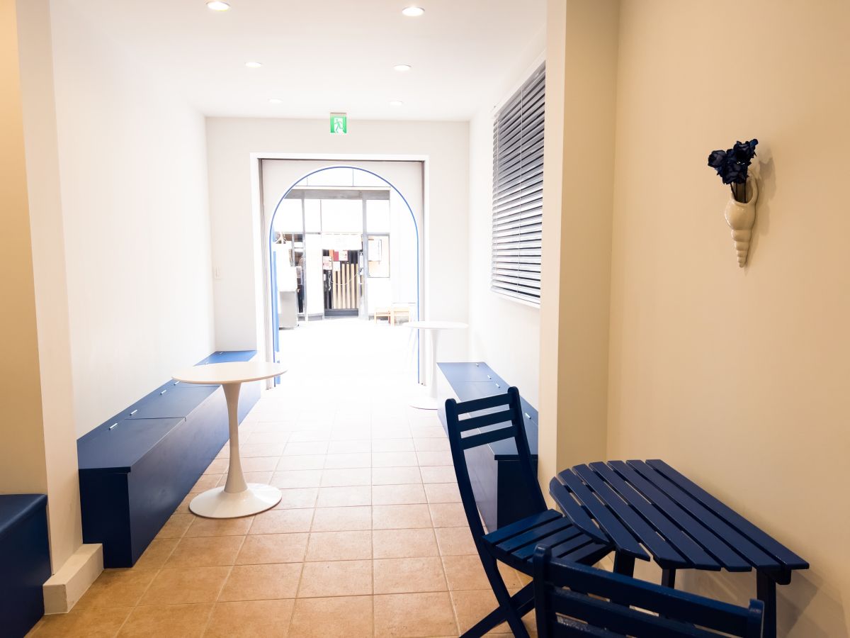 店内はエーゲ海サントリーニ島をイメージした青と白の空間です。小町通りにありながらイートインスペースも15席ほどあるので、暑い日の休憩にもぴったりな場所です。