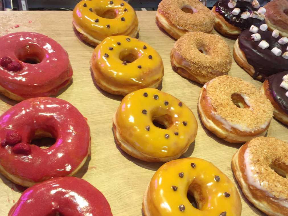 ショーケースにはカラフルでインスタ映え抜群なフレーバーを常時10種類以上そろえています。鮮やかなピンクのフランボワーズや、チョコチップでアクセントをつけた黄色いパッションフルーツなど、どれもユニークな味のドーナツだから、ついついおかわりしたくなっちゃいそう。
