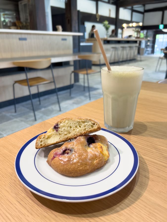 「Pacific BAKERY」で1番人気のスコーンも!写真は「ブルーベリークリームチーズスコーン」400円と、デトックス効果の高いといわれるサンシャインジュースのスムージー「スギナ」750円。パンは日によってお昼過ぎに売り切れてしまう人気商品です。