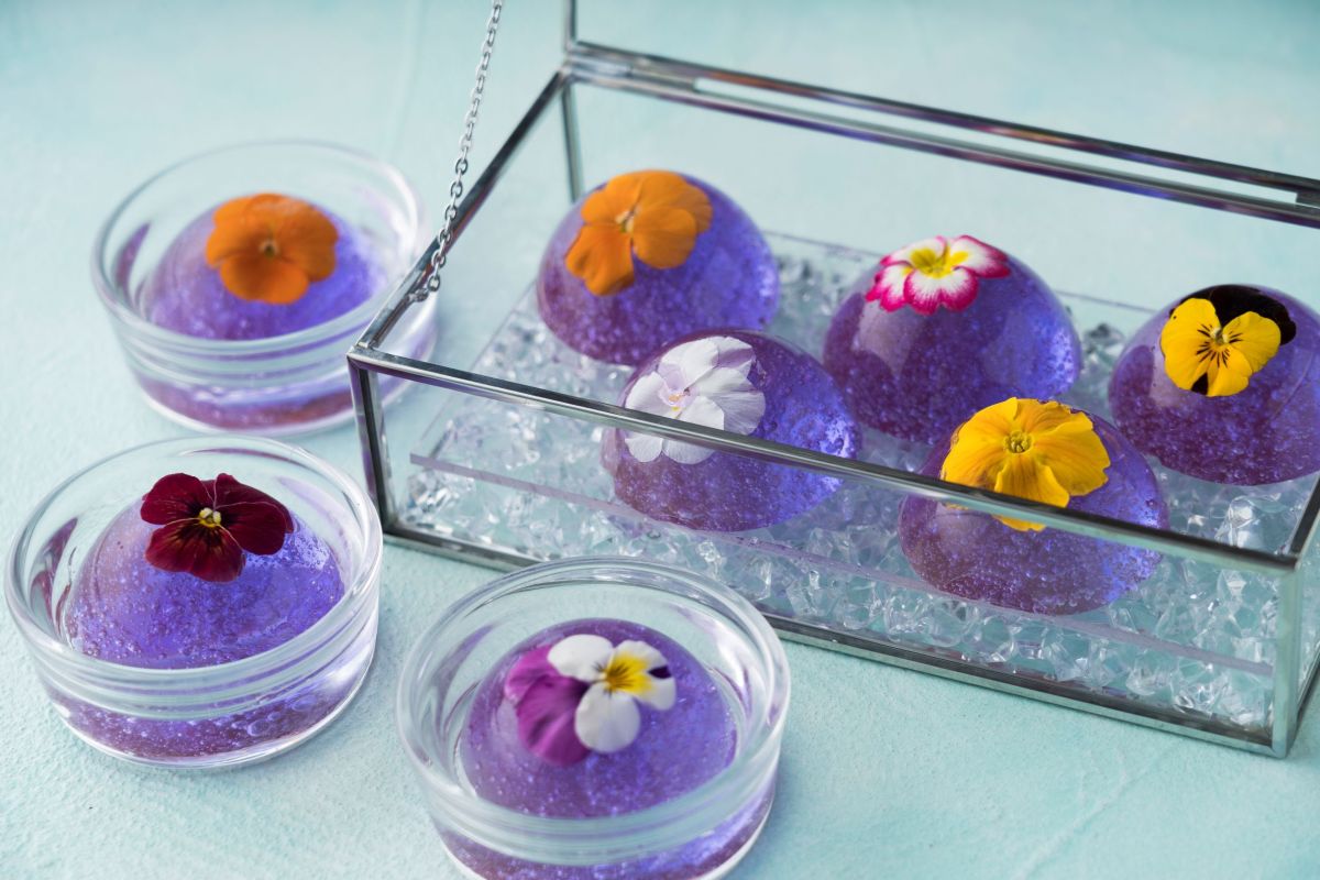 ビーチを連想させる美しいスイーツにも目が離せません。「ラベンダーゼリーのエディブルフラワー添え」はビーチに漂流するキラキラとした貝殻やシーグラスをイメージした、夏らしいゼリーです。