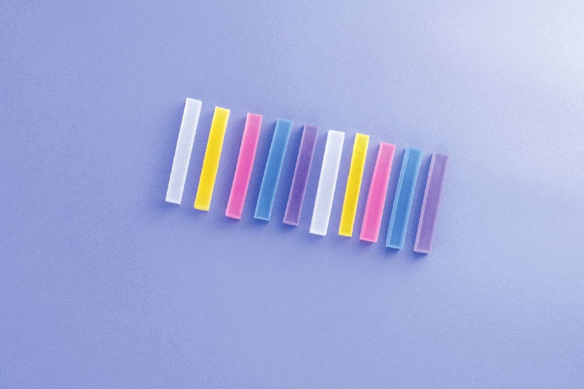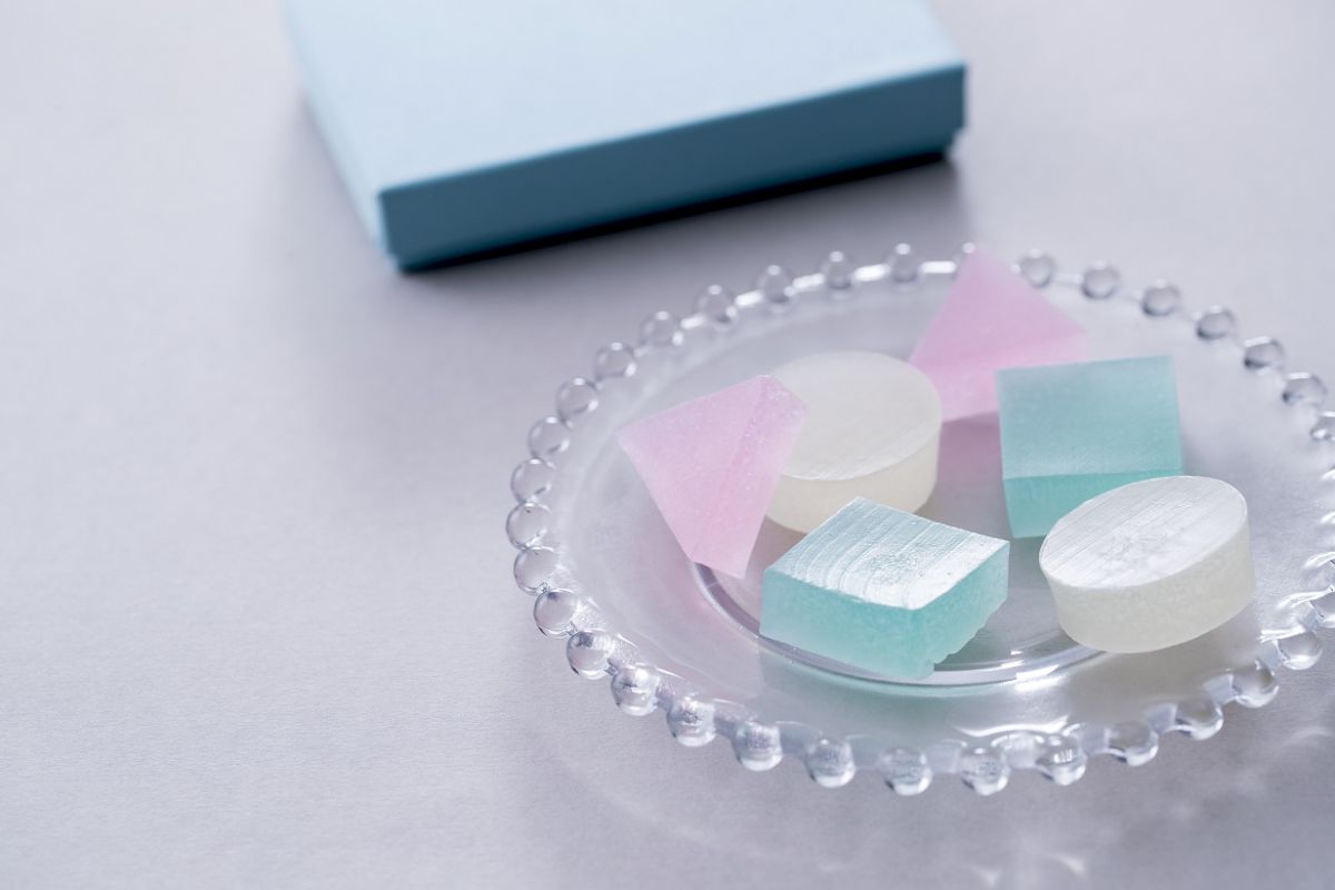 写真の「琥珀糖」は、シャリっとした食感のスティックタイプの干菓子(ひがし)で、フレーバーはラベンダー、ミント、ローズ、カモミール、ジャスミンの5種類。和菓子の老舗らしからぬフレーバーが新鮮です。クリアケースに入ったパステルのようなデザインも、お土産に喜ばれそうですね。